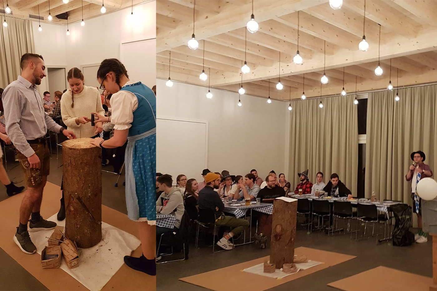Nach der Begrüssungsrede durch den seit 23 Jahren Mitgliederbeitrags-zahlenden Claudio fanden die gut betuchten Gäste sobald alle die Bar, welche den grosszügig kalkulierten Biervorrat leerten. Angeheitert durch die diversen flüssigen Stimmungsmacher lieferte der erste Spieldurchgang schon entscheidende Punkte für die vier verschiedenen Teams. Beim Krug-Stossen, Nageln, Lebkuchen-Herz verzieren sowie Büchsen-Schiessen (herzlichen Dank an dieser Stelle an Oli den Zimmermann, für den Einsatz bei der Erstellung der diversen Posten) versuchten die Teams, so viele Punkte wie möglich zu sammeln. Dies wurde mehrheitlich gut gelöst. Es wurde jedoch festgestellt, dass das Know-How und die Expertise der nicht an den Spielen teilnehmenden Herren 3 Vertreter gefehlt haben. Die Hendl, welche während den Spielen für den kulinarischen Höhepunkt (hihi) gesorgt haben, wurden allesamt mit Hochgenuss verspiesen. Die Entscheidung bezüglich der Gewinnergruppe wurde letztlich durch ein knappes Nageln entschieden. Aufgrund des Bierkonsums während des Berichteschreibens wissen wir nicht mehr, welche Gruppe gewonnen hat. Herzlichen Glückwunsch an dieser Stelle!