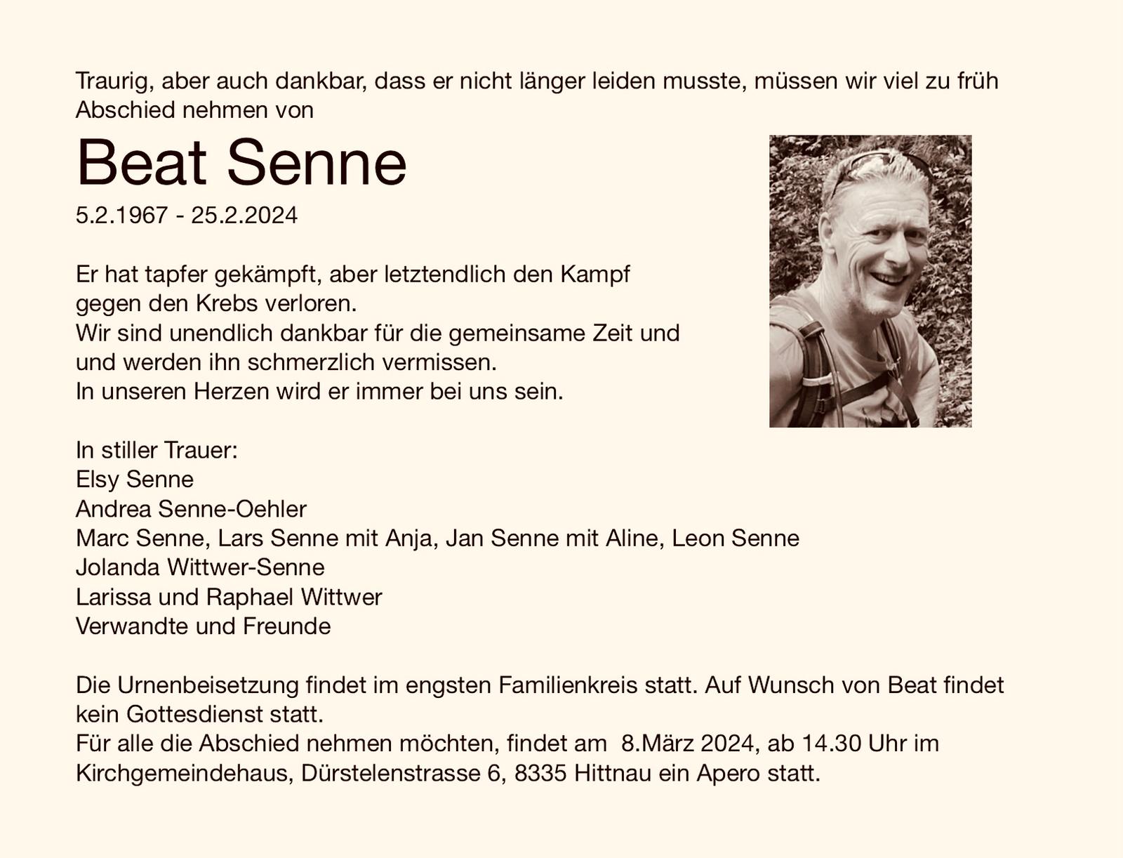 Die Urnenbeisetzung findet im engsten Familienkreis statt. Auf Wunsch von Beat findet kein Gottesdienst statt. Für alle die Abschied nehmen möchten, findet am 8. März 2024, um 14:30 Uhr im Kirchgemeindehaus in Hittnau ein Apéro statt. Trauerbekleidung ist nicht nötig.